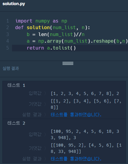 얼마전에 딥러닝 공부하면서 배운 numpy 의 np.array().reshape(a,b)를 활용해서 풀라그랬는데